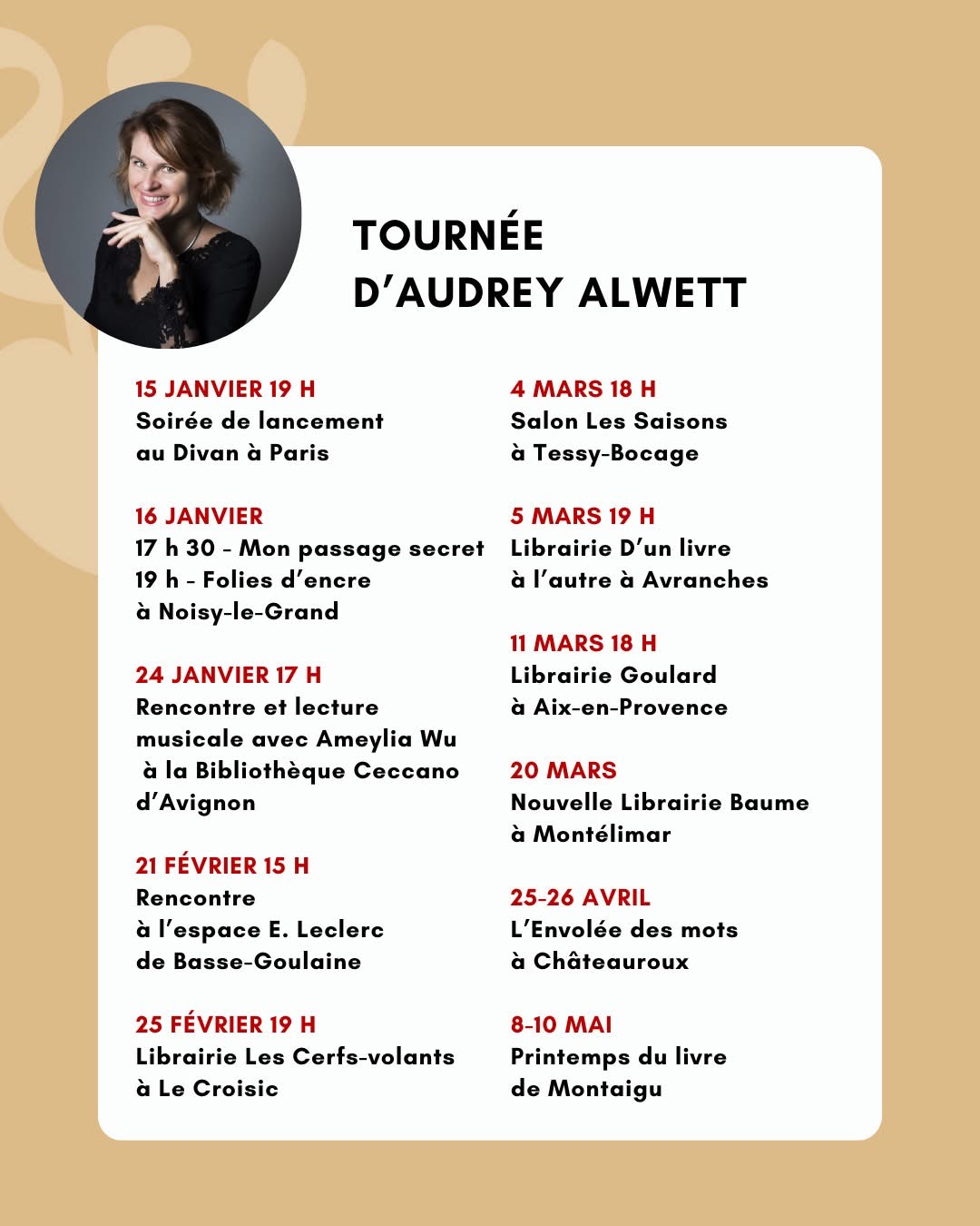 En 2026, Audrey Alwett se lance dans la littérature générale avec le roman Sainte Emmerderesse, aux Éditions Héloïse d’Ormesson, qui narre la renaissance d’une sainte malicieuse, insolente et vengeresse.
